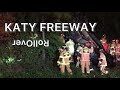 The Driver of a Pickup truck was traveling eastbound on the Katy freeway when he lost control of his vehicle and struck another truck from the rear , causing it to roll off the freeway before coming to a stop nosed down on an embankment., Vehicle came to a stop on its roof top, trapping the driver inside the vehicle, HFD and Rescue worked to extract the Driver for about 30 minutes. Driver eventually was transported to an area Hospital , His condition is unknown. REAL SCENE VIDEO